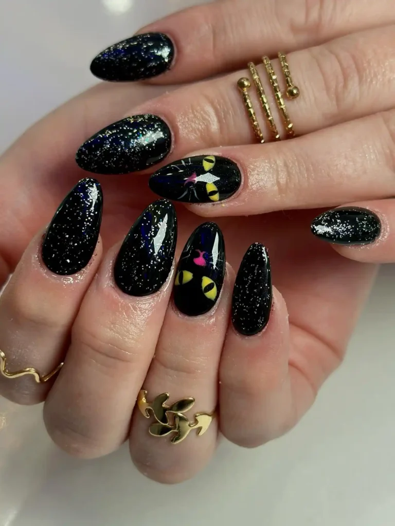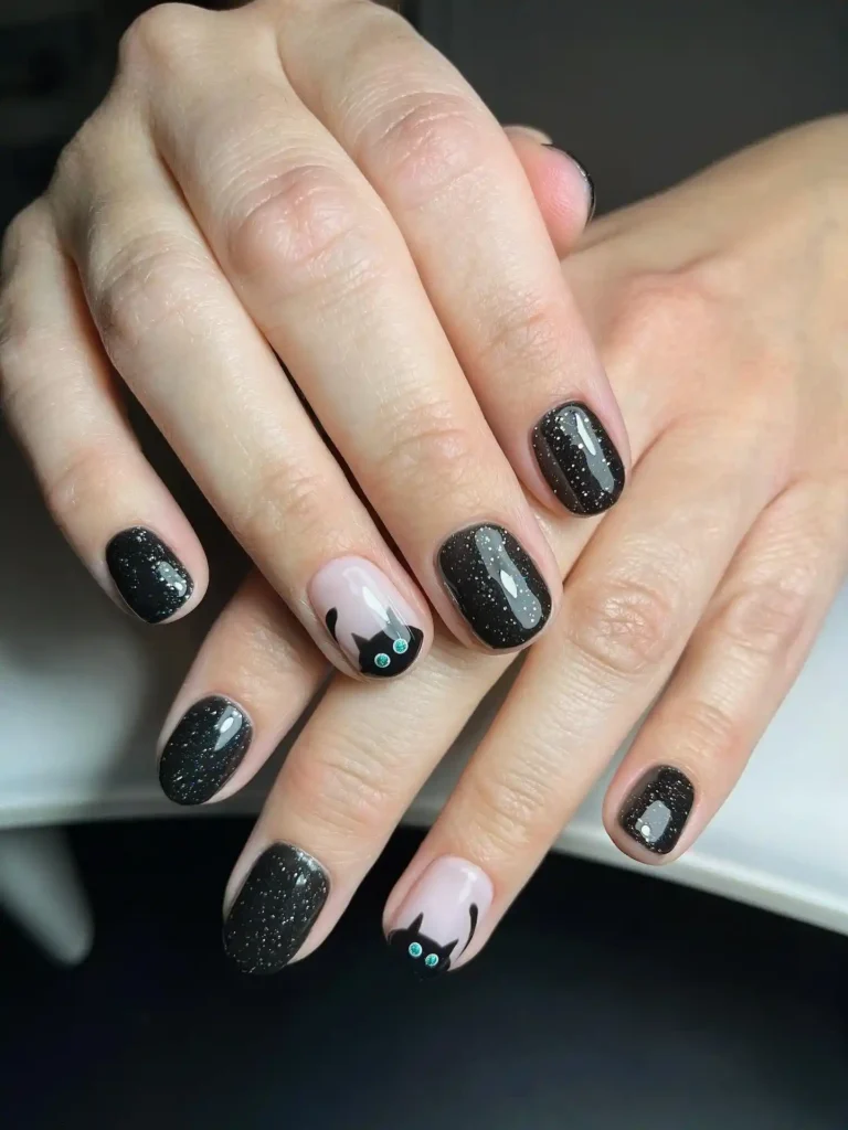 I wanted something short and practical but still fun, so I kept them nice and round. Most nails are glossy black with that perfect scattered silver glitter, then I painted tiny black cat silhouettes on the ring fingers and gave them little emerald rhinestone eyes.