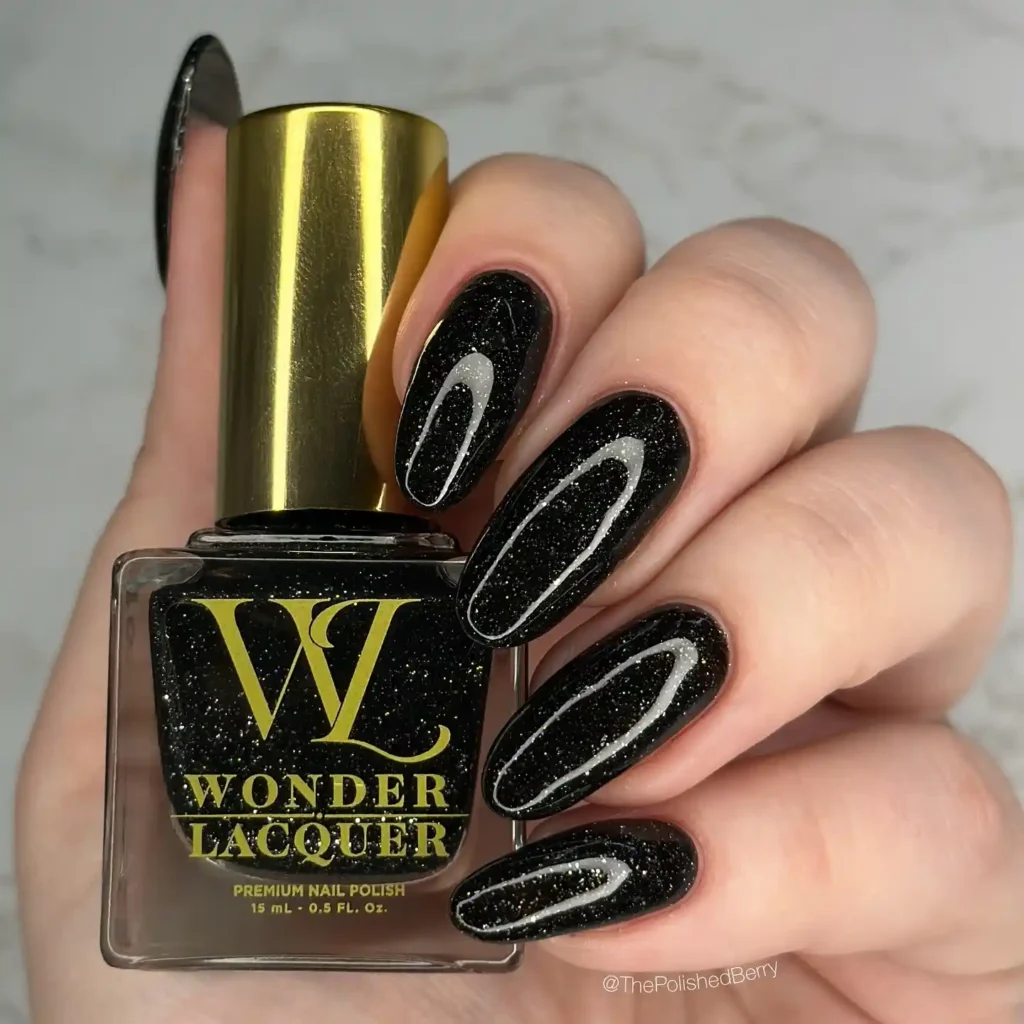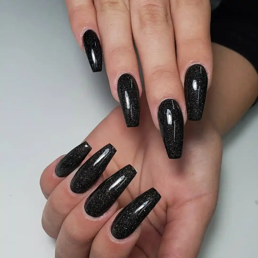 These are giving full vampire goth-glam and I’m here for it. The black is so saturated and the micro-glitter is packed so tight it looks like wet asphalt under streetlights, but way prettier.