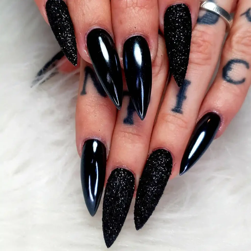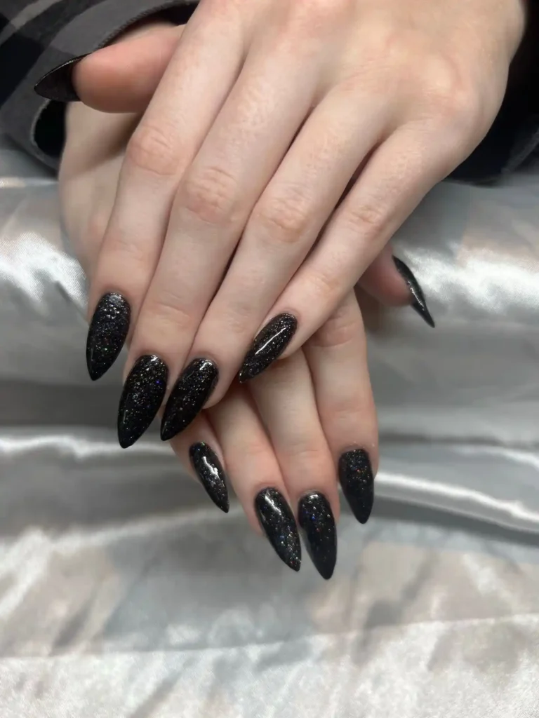 These are pure villain energy in the best way. The stiletto shape is lethal and the black glitter is so dense it looks like spilled ink mixed with crushed diamonds.
