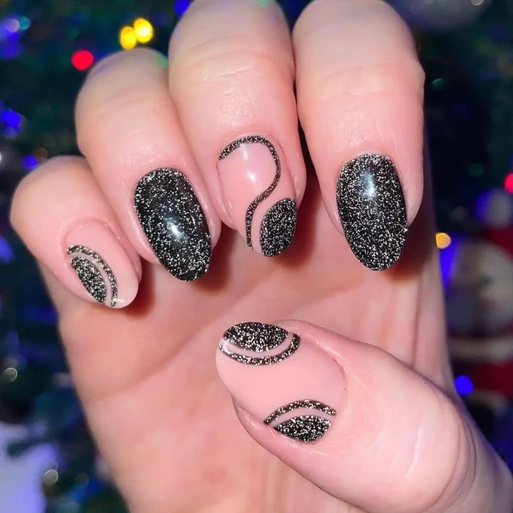 Soft nude base with delicate black micro-glitter swirls that catch the light like tiny constellations. Clean, modern, and perfectly understated for the holidays.