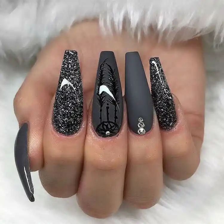 These long coffin nails feel bold and edgy with their mix of matte black, shimmer, and glitter.
