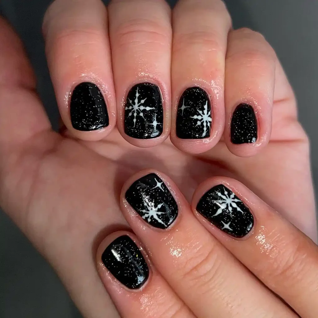 I wanted something that felt like a clear night sky without screaming “holiday party.” Just a few delicate silver stars scattered across glossy black glitter, super subtle until the light hits and then boom, tiny flashes everywhere.
