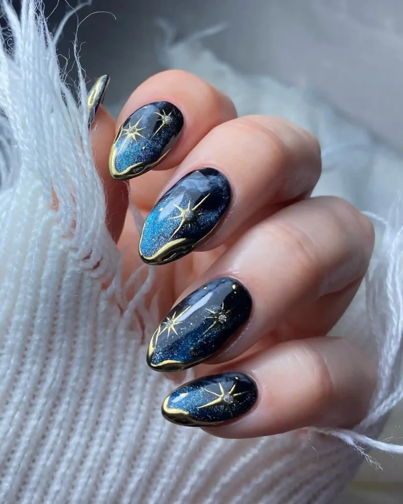 These nails remind me of a night sky with a hint of blue shimmer. I love the way the gold borders and star shapes catch the light.