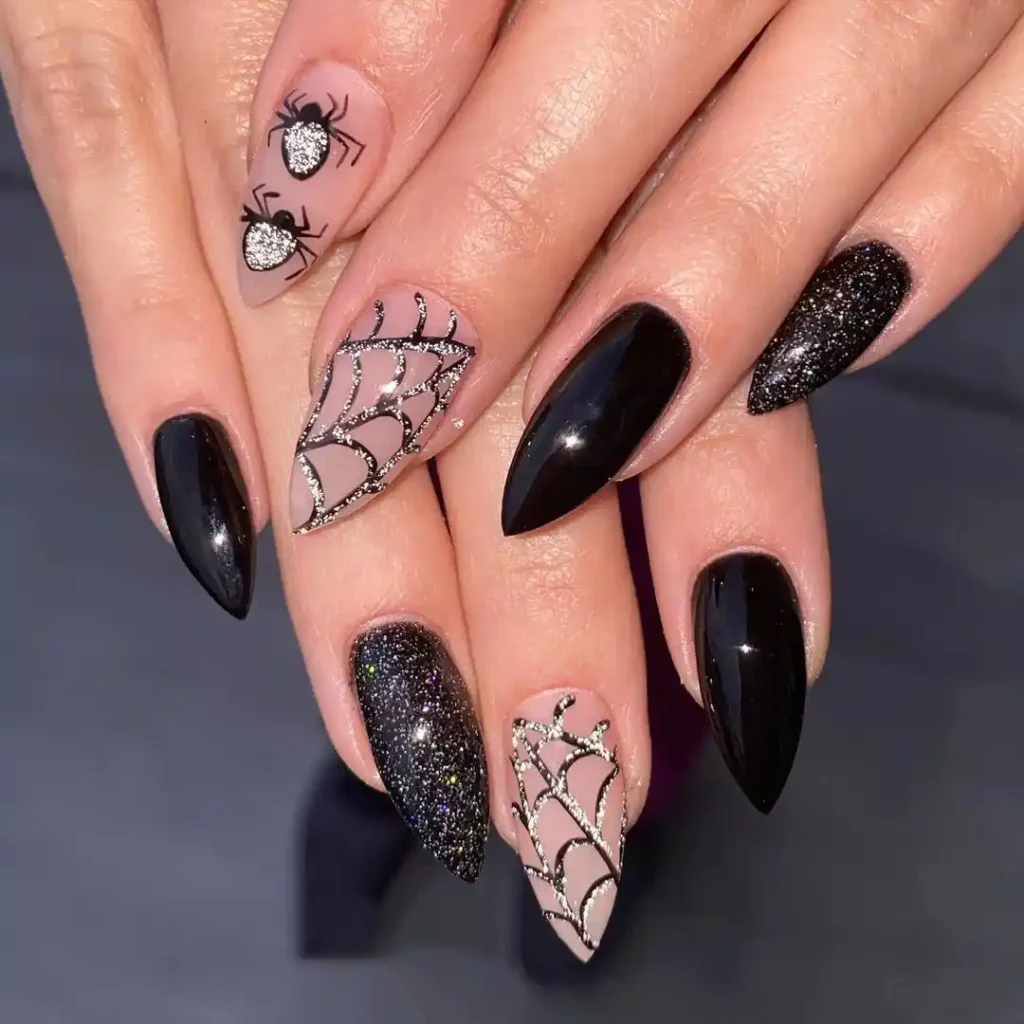 I like how these nails mix glossy black with glitter and nude web designs. The tiny silver spiders add just enough drama without going full costume. This set makes my hands look ready for a spooky night out.