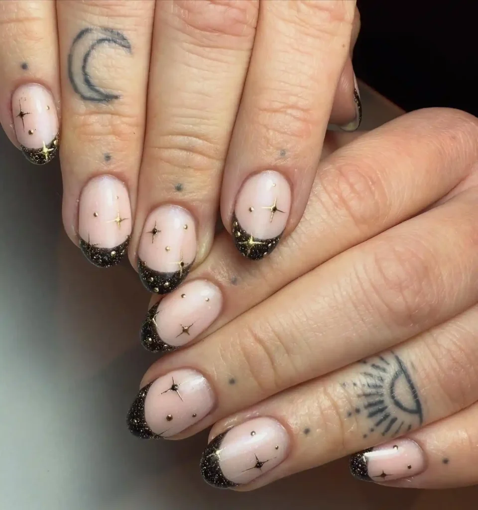 I like how the nude base keeps these nails soft while the black glitter tips add edge. The tiny gold stars make each nail look like a mini galaxy. It feels delicate and magical at the same time.