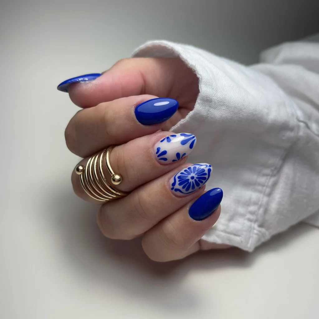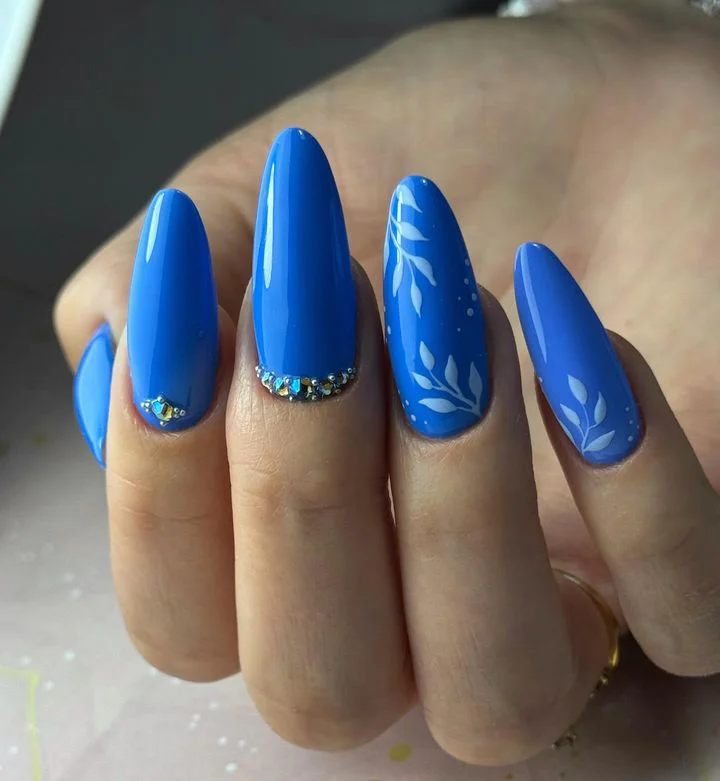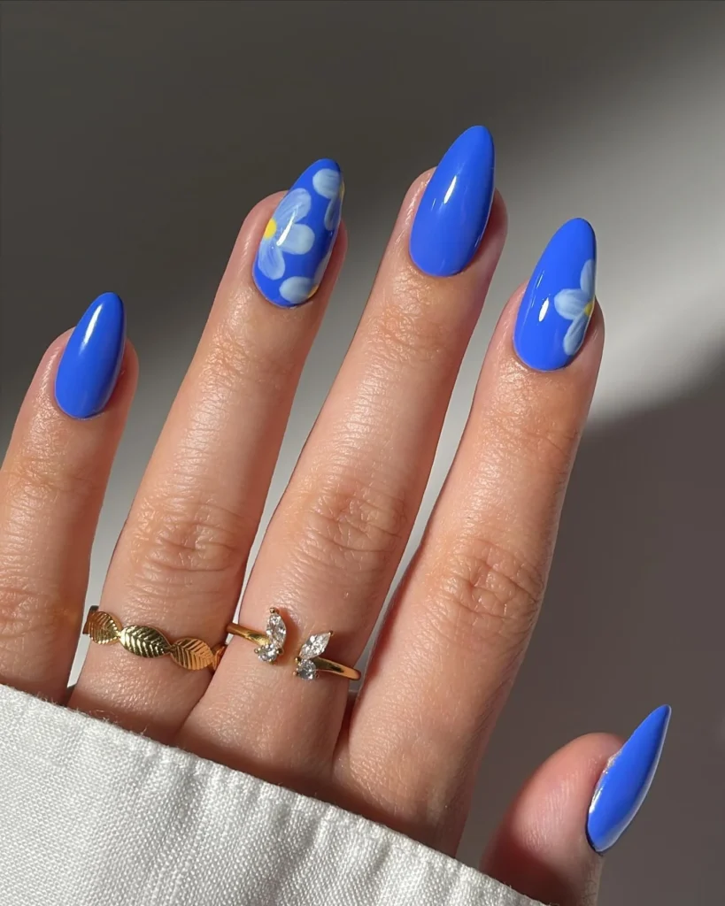 There’s something about this look that makes me smile instantly. The electric blue base feels bold and confident, while the soft white daisies bring in that dreamy, feminine charm. It’s giving “spring day with iced coffee in hand” energy.