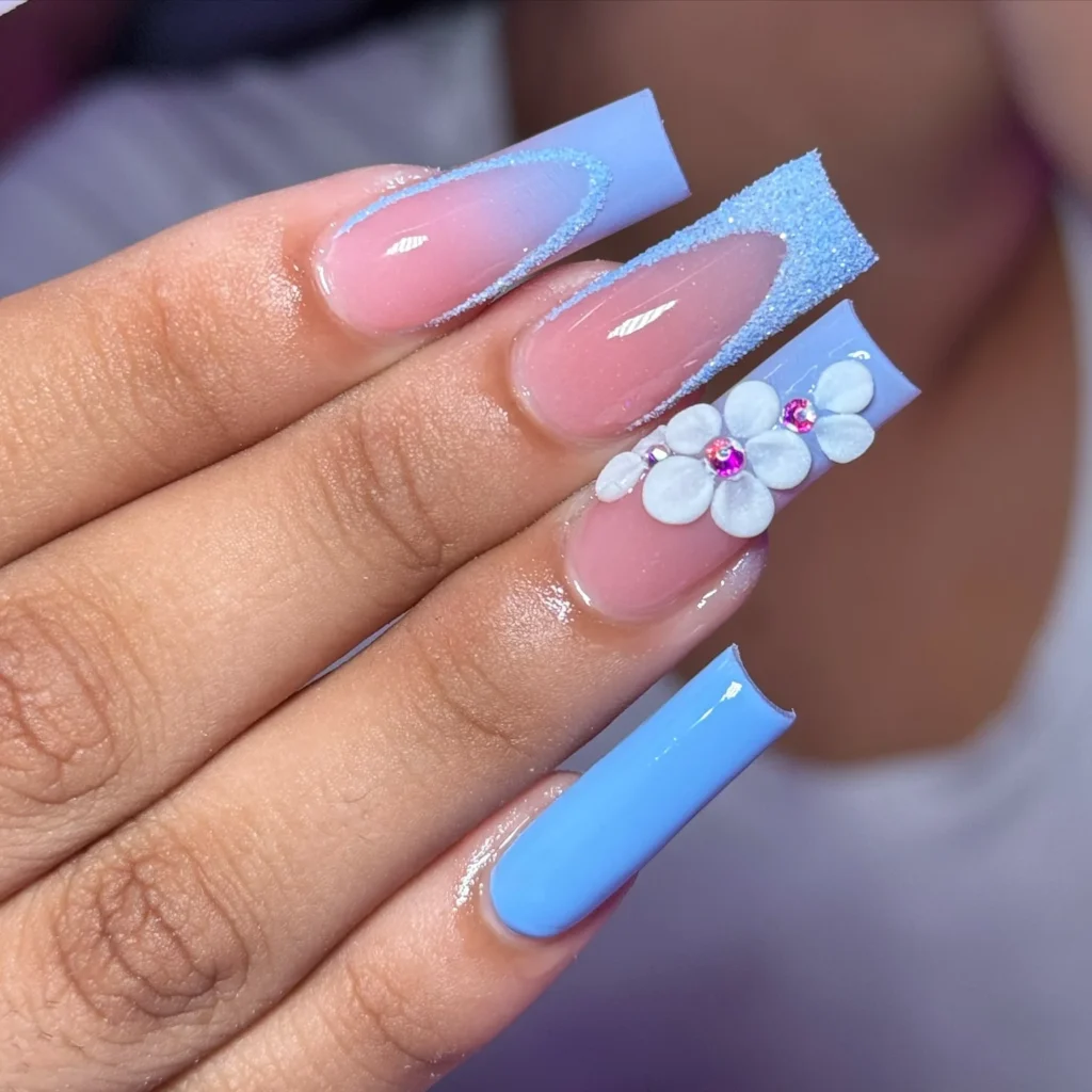 This one’s pure joy, the mix of nude pink base, blue tips, and little 3D flowers feels like spring in a bottle. It’s elegant yet playful and I can’t stop staring at that shimmer!