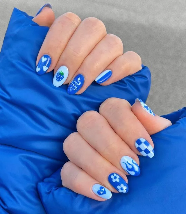 Soft and spirited this mix of patterns feels like a story painted in shades of sky and cobalt. From little hearts to strawberries and flames each nail carries a fun personality that brightens the day. The contrast of white and blue makes every detail pop with cheerful charm.