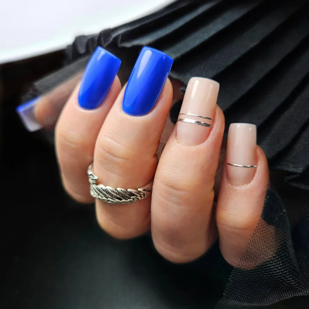 Chic and balanced this nail look blends nude elegance with striking cobalt polish. The metallic accents add a touch of sophistication perfect for work or dinner nights. It feels modern minimalist and effortlessly confident.