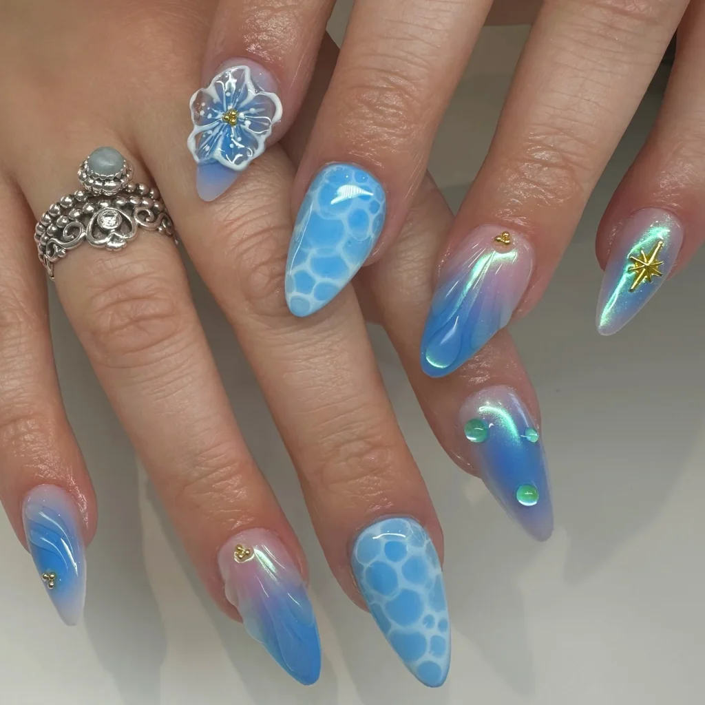 Dreamy like waves meeting sunlight this design mixes pastel blues with pearly reflections. The tiny gold accents and 3D flower details bring a soft luxurious mood. It feels refreshing delicate and full of movement like catching the shimmer of the sea.