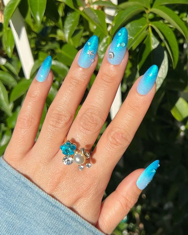 Fresh and radiant this ombre blue style sparkles like a summer sky over the ocean. Tiny pearls and shells make it feel beachy and graceful. Every movement glows with light giving soft mermaid energy that fits sunny days perfectly.