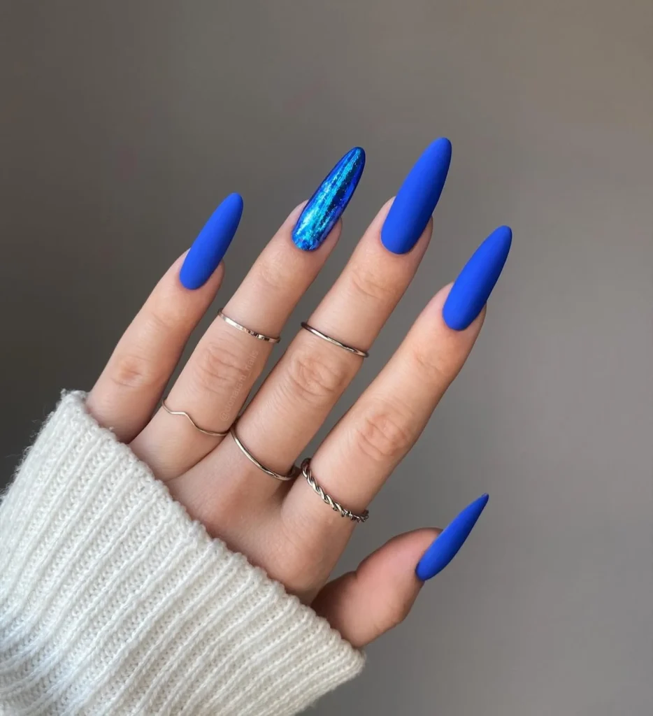 I love the contrast here — that matte blue finish paired with a single shimmering accent nail? Obsessed. It’s minimalist but statement-making. Perfect for those “I didn’t try too hard but still look amazing” days.
