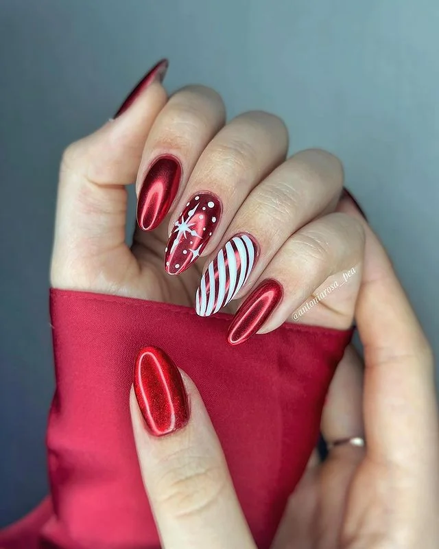 These nails look like Christmas chic straight off a runway. Metallic red pairs with candy cane stripes and delicate white starbursts. Sleek, modern, and effortlessly glamorous—holiday nails don’t get more polished than this.