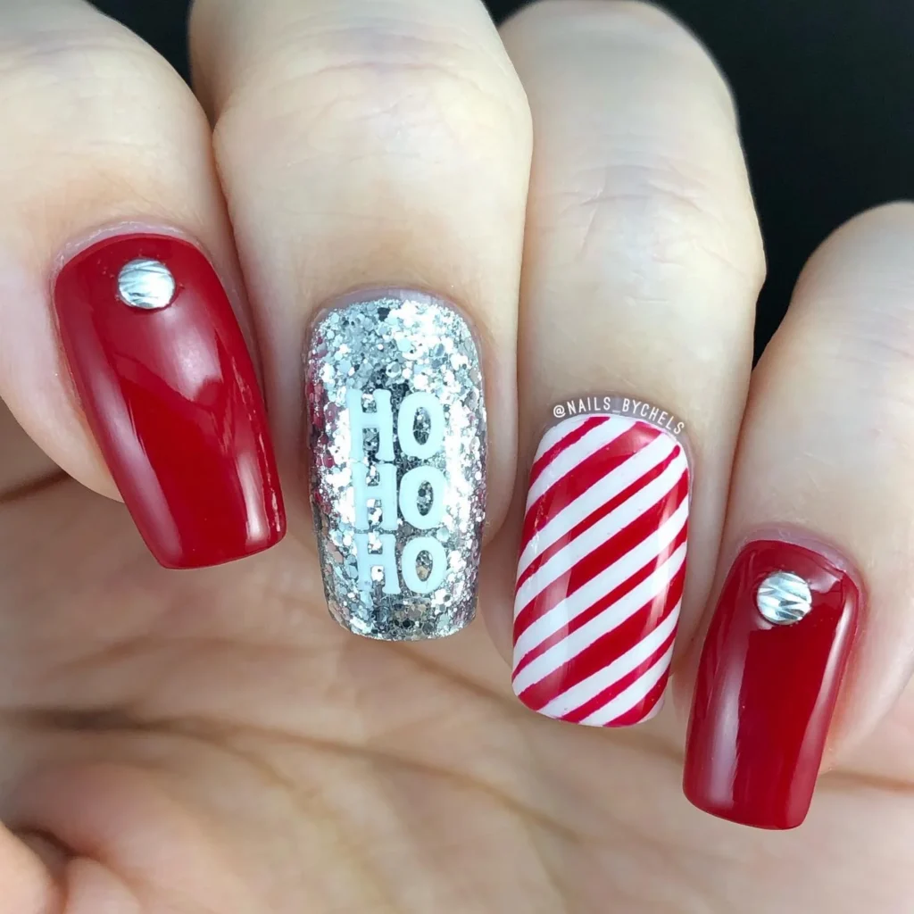 - Use chunky silver glitter polish on the middle finger and stamp or paint “Ho Ho Ho.”