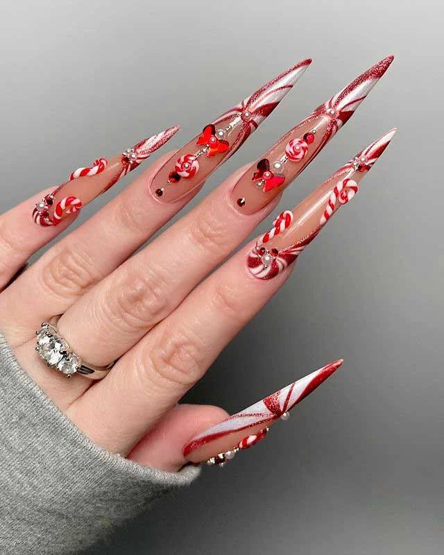 #12. Extravagant 3D Candy Cane Stiletto Nail Glam