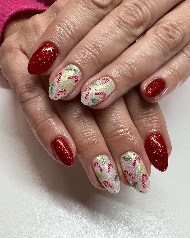 Chic, simple, and still festive—this design balances candy cane art with sparkly red nails. It’s the perfect choice if you want holiday nails without going over the top.