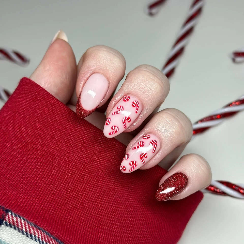 Pro Tip: Stick to a soft nude base so your candy canes pop.