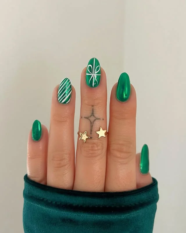 Who said candy cane nails had to be red and white only? This green-and-white striped candy cane accent, paired with a ribbon nail, is giving full-on holiday gift vibes.