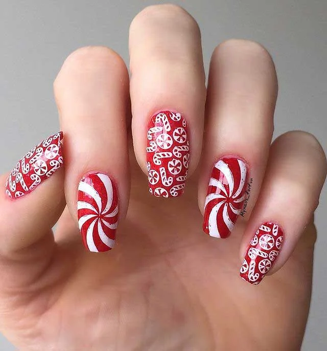 Honestly, these nails look like they came straight from a candy shop. The bold peppermint swirls and tiny candy accents will have you craving actual sweets.