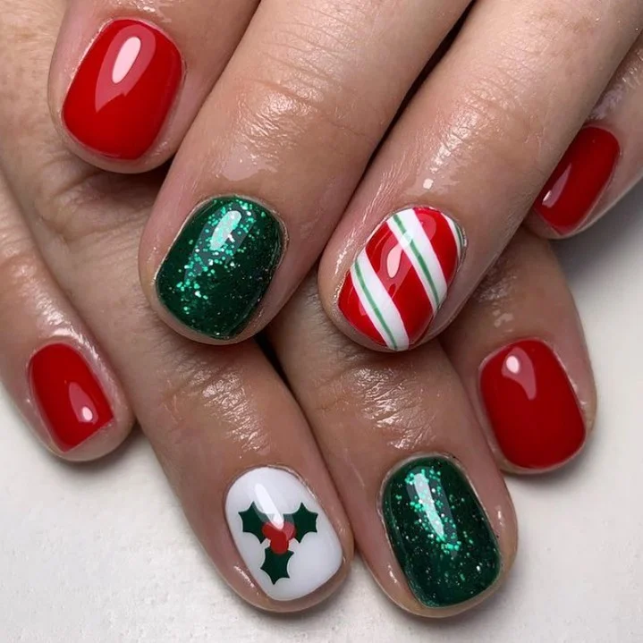 This design blends Christmas holly, green glitter, and candy cane stripes for a nail look that’s straight out of a holiday storybook. Cute, colorful, and absolutely festive.