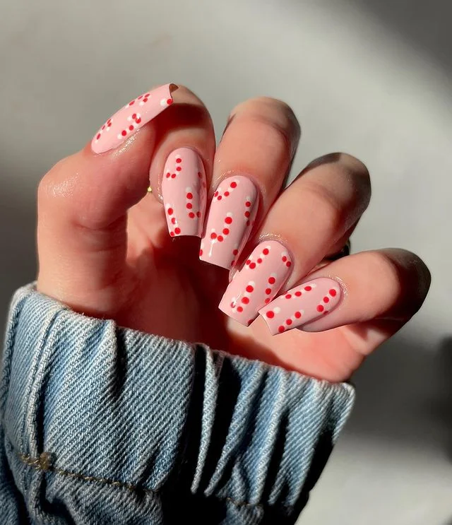 Sometimes less really is more. These nude nails with dainty red dots give off candy cane vibes without being loud. They’re festive, but also subtle enough for every day.