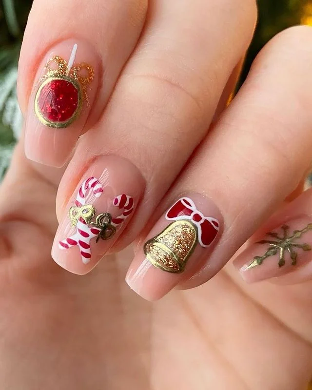 These nude nails with candy cane accents, golden bells, and festive bows look like tiny Christmas ornaments on your hands. It’s delicate, detailed, and beyond festive.