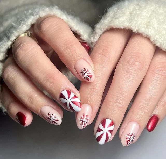 These nails look like they belong in a holiday snow globe. The mix of peppermint swirls, snowflakes, and red shimmer is pure Christmas magic.