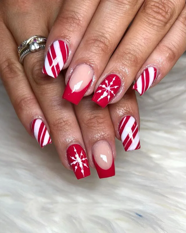 Classic red-and-white stripes meet square-tip French style. Add in a snowflake accent, and you’ve got the ultimate festive combo. It’s modern, stylish, and totally Instagram-worthy. These nails feel like Christmas morning wrapped in polish.