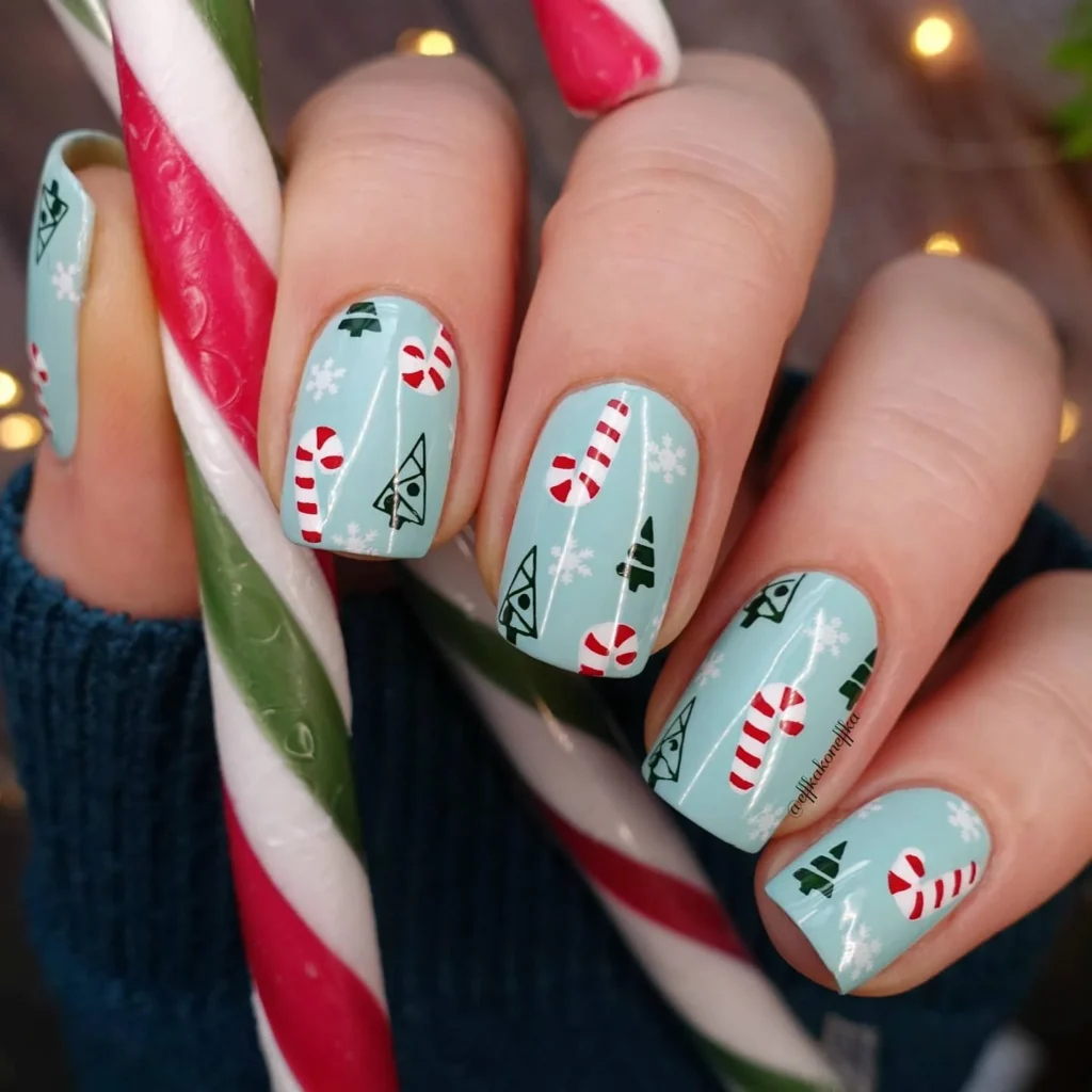 Not all candy cane nails have to be red! This frosty blue design with candy cane and Christmas tree decals feels winter-fresh. It’s playful and gives a modern twist to holiday classics. Think Frozen meets Christmas cheer.