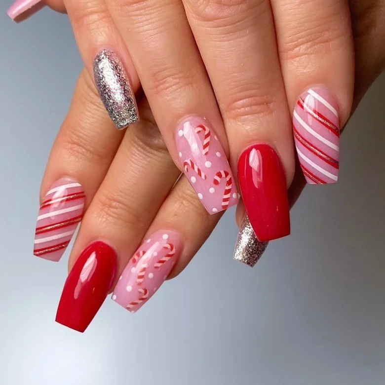 Sweet, girly, and festive—this design mixes candy canes, stripes, and silver glitter with a pop of red. It’s like candy cane Barbie nails, and we’re here for it. Who said holiday nails had to be all red and green?