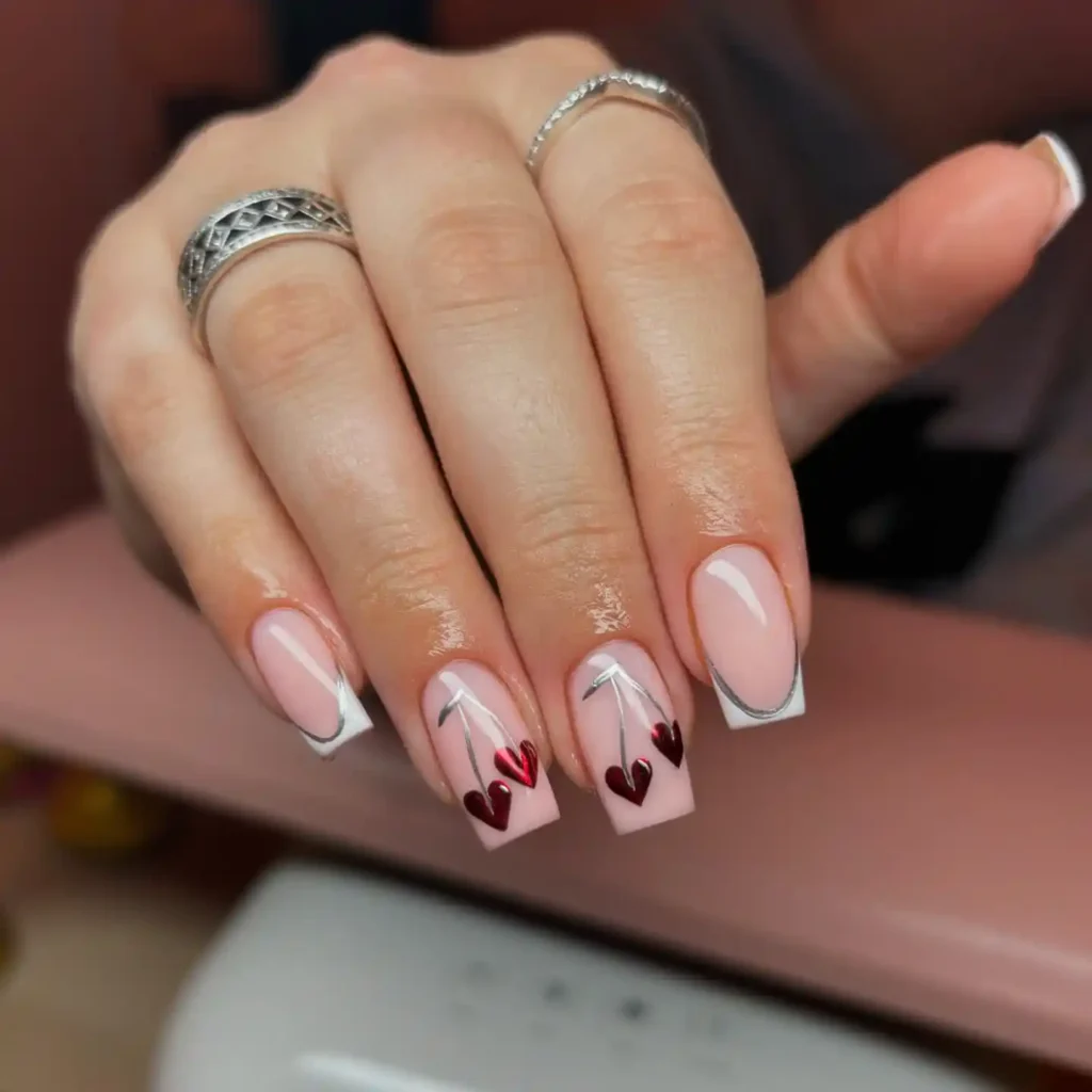 #2. Minimal French Tips With Metallic Cherry Hearts