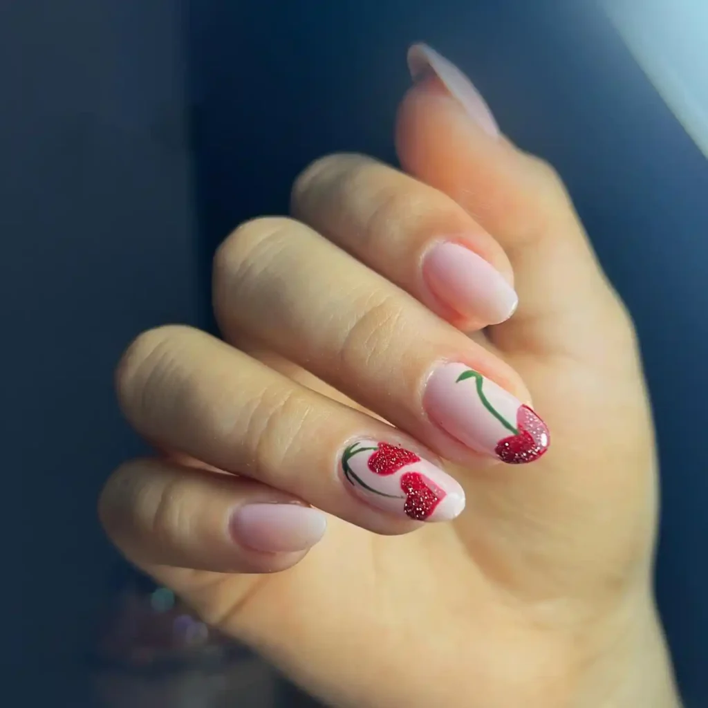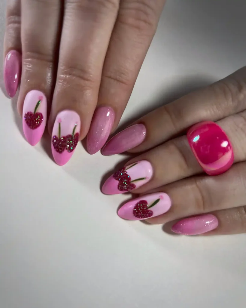#17. Glitter Pink Nails with Bright Heart Cherries