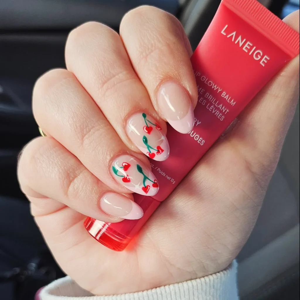 These nails make me think of summer instantly, the bright red tips paired with the tiny cherries feel so fresh. I like how the design covers some nails fully while others stay clean with just the red edge. The mix keeps it interesting without going overboard. They feel fun enough for vacations but still wearable day to day.