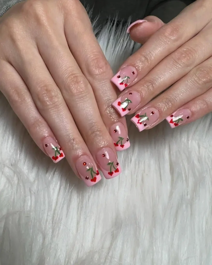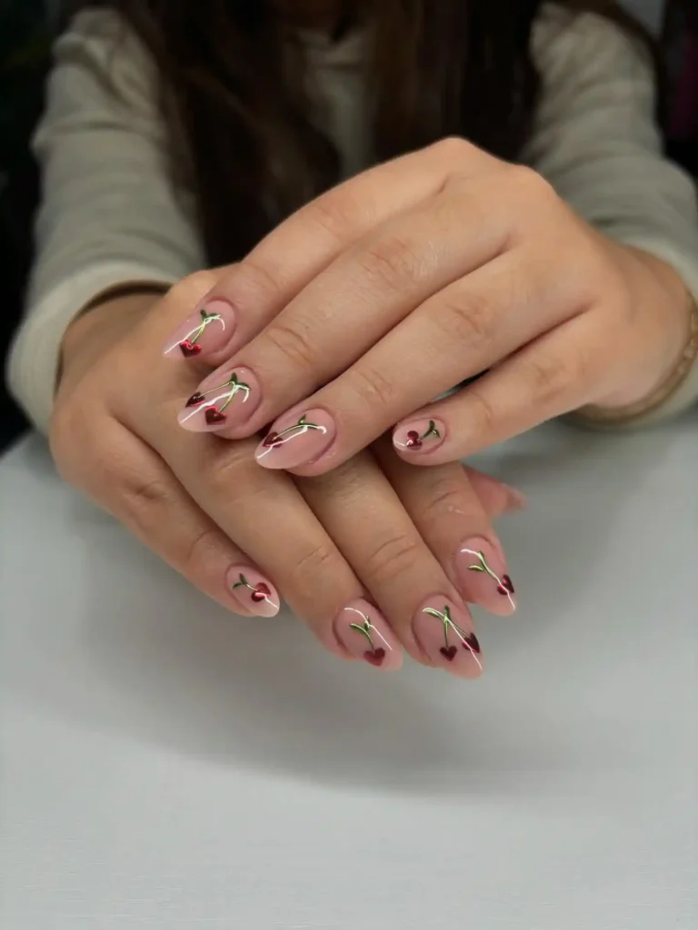 #18. Delicate Heart Cherries on Sheer Nude Nails