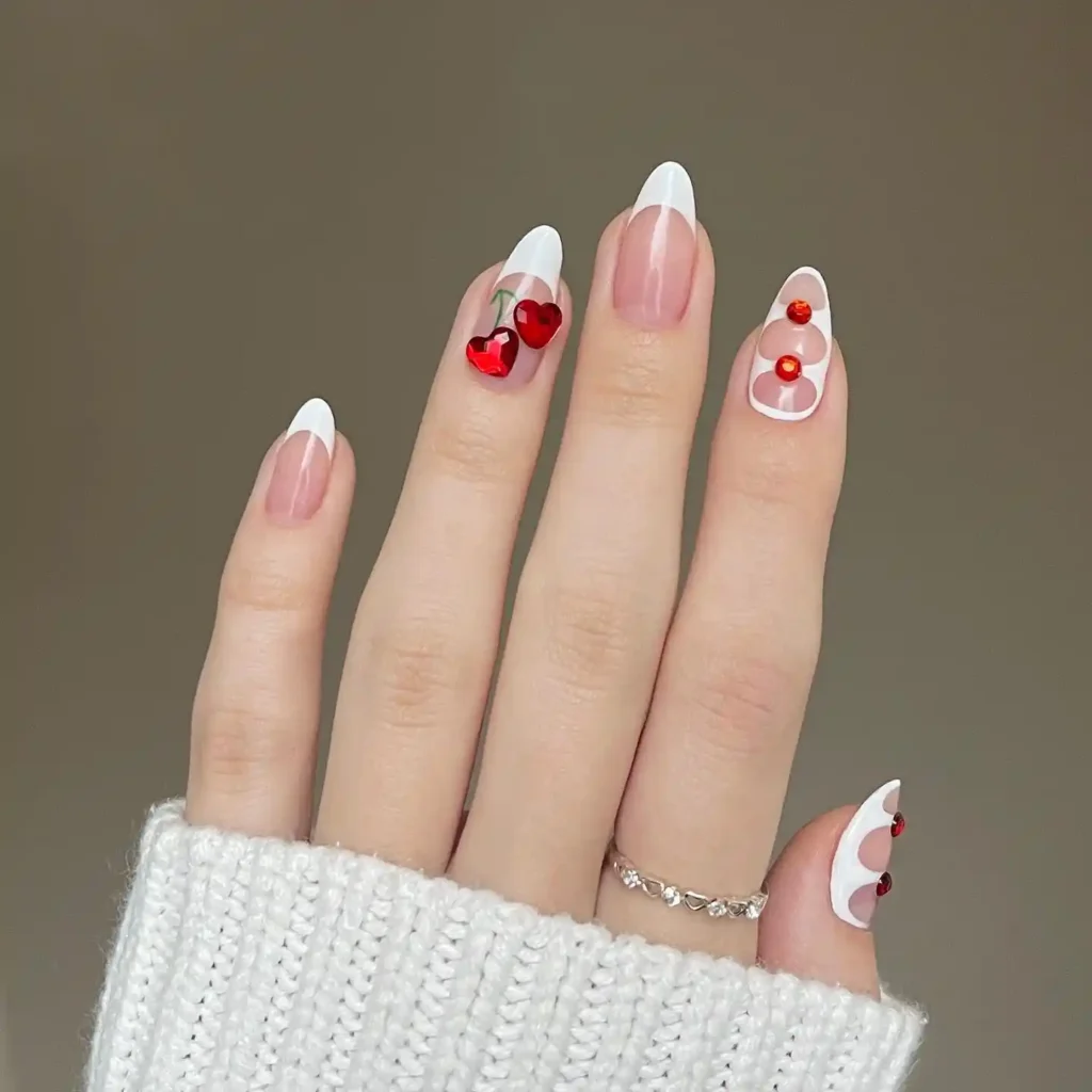 #7. Delicate White-Tipped Nails With Tiny Cherry Hearts