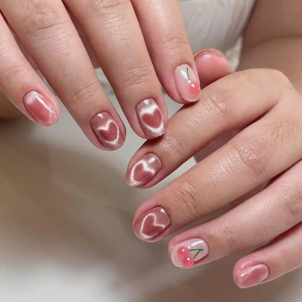 #5. Shimmery Heart Nails With a Sweet Cherry Accent