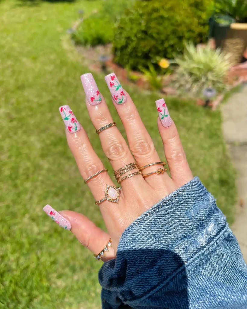 #6. Glittery Pink Nails Covered in Cherry Patterns
