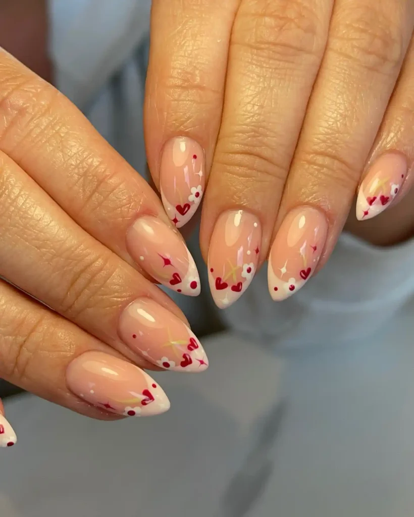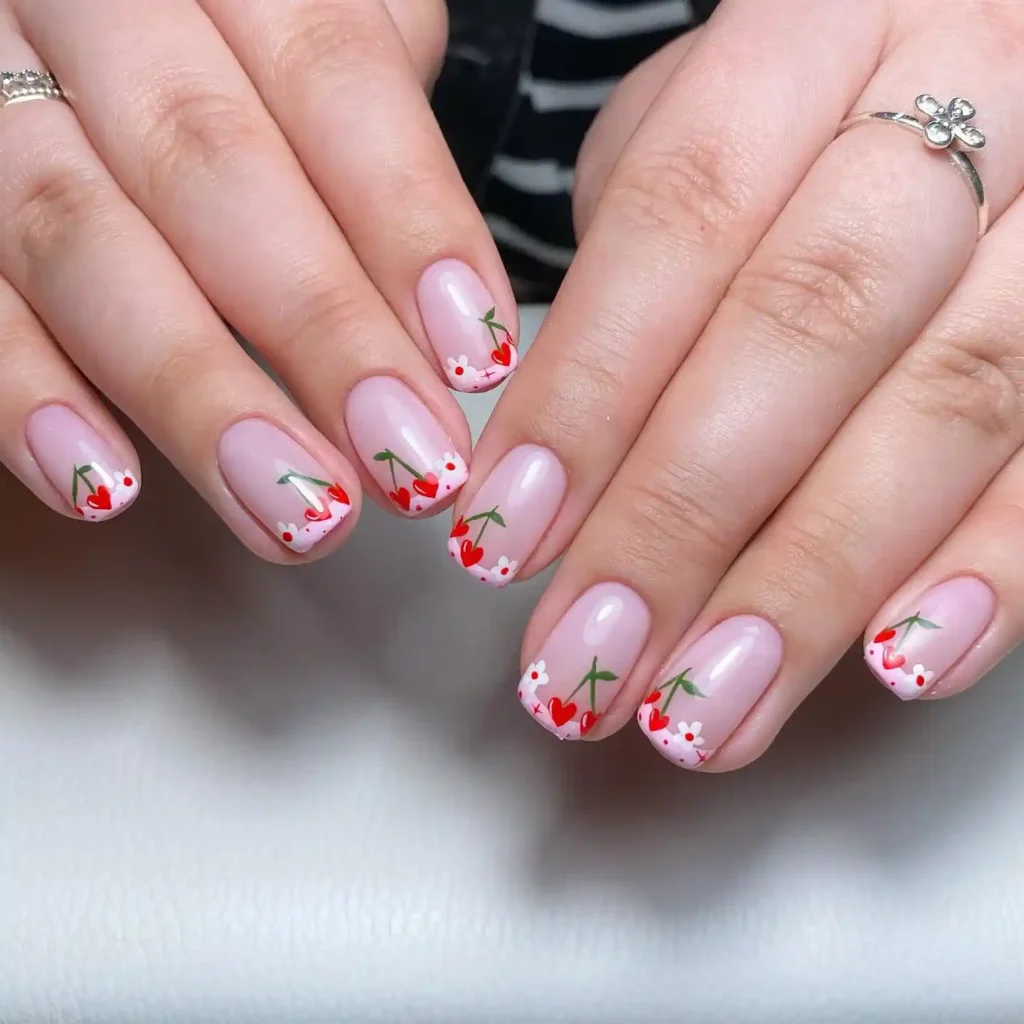 I love how these nails mix tiny flowers with the little cherry hearts, giving the whole set a cute garden vibe. The white tips keep everything looking clean so the little red details really stand out. They remind me of warm weather and being outside. I’d definitely wear these during spring or for something simple and cheerful.