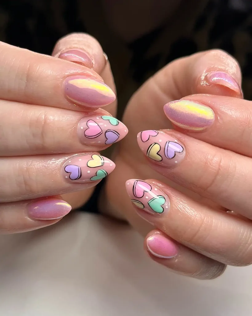 I chose a shimmering holographic finish to give these nails a dreamy glow. Small pastel hearts with black outlines add a playful touch to the iridescent base.
