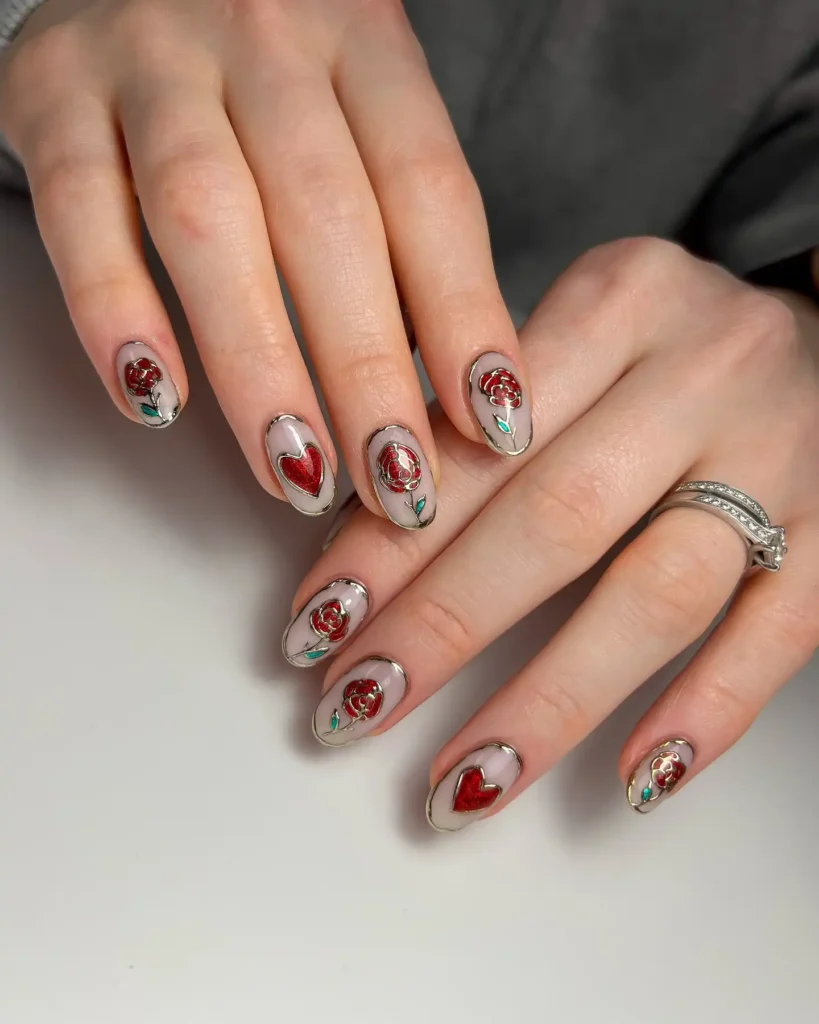 I opted for a sophisticated nude base to let these intricate 3D red roses truly shine. Each bloom is outlined with a fine gold metallic rim that gives the art a vintage jewelry like feel.