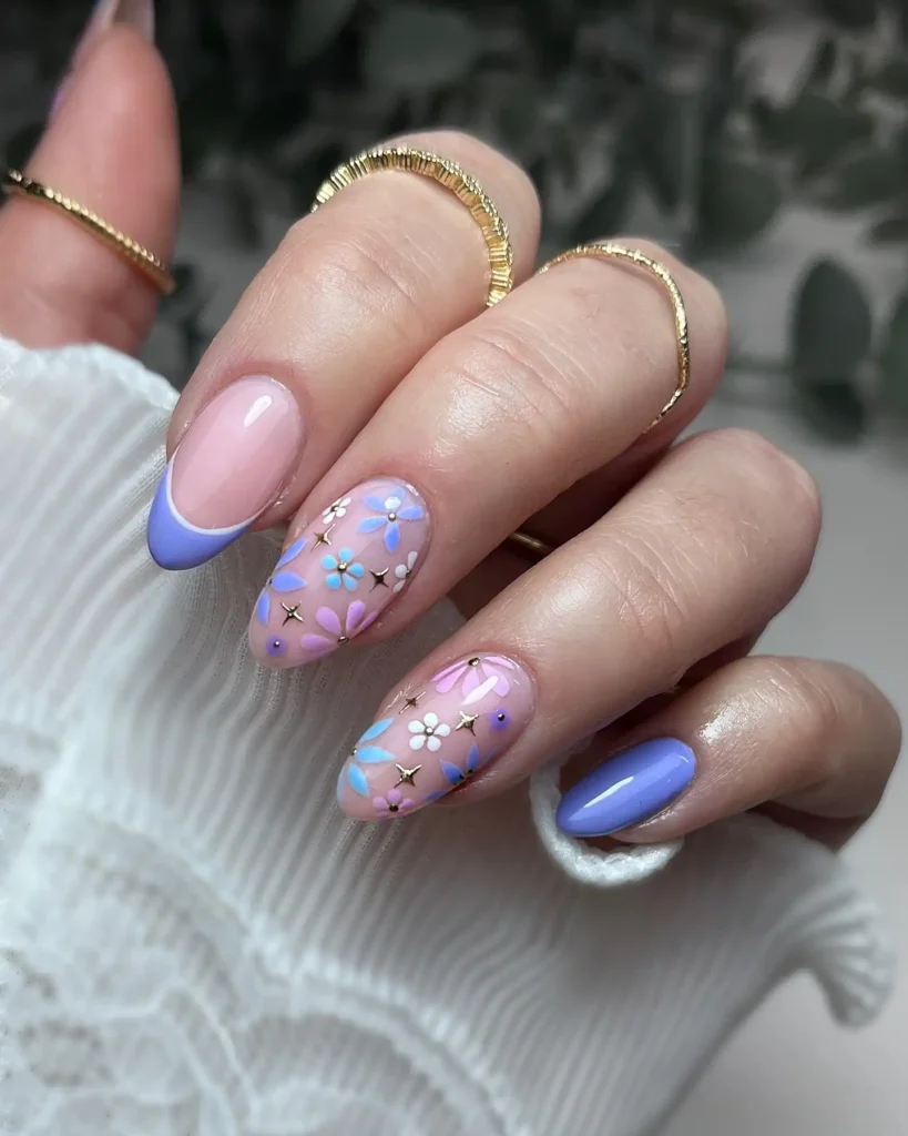 I wanted to capture a fresh springtime vibe using soft lilac and cornflower blue tones. Delicate hand-painted petals and tiny gold stars cover the center nails for a whimsical touch.