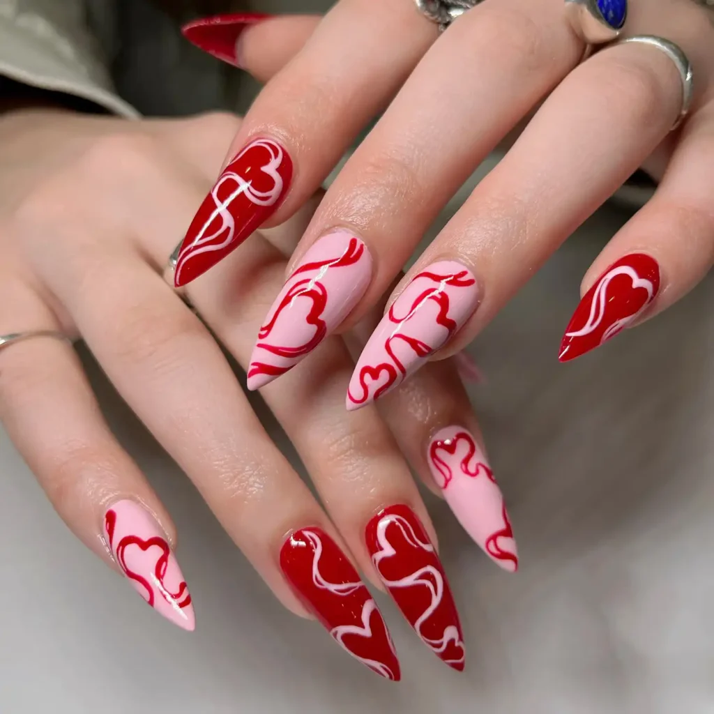 I love the high energy feel of these stiletto nails featuring bold red and white swirls. The flowing lines form abstract heart shapes that dance across a soft pale pink base.