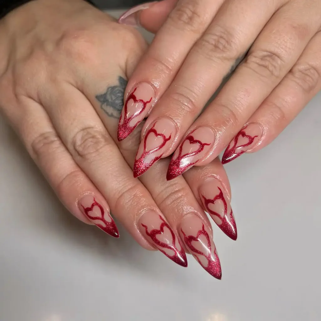A glossy nude base ensures the focus remains on the glittery linework. This look is perfect for those who like a spicy twist on romance.