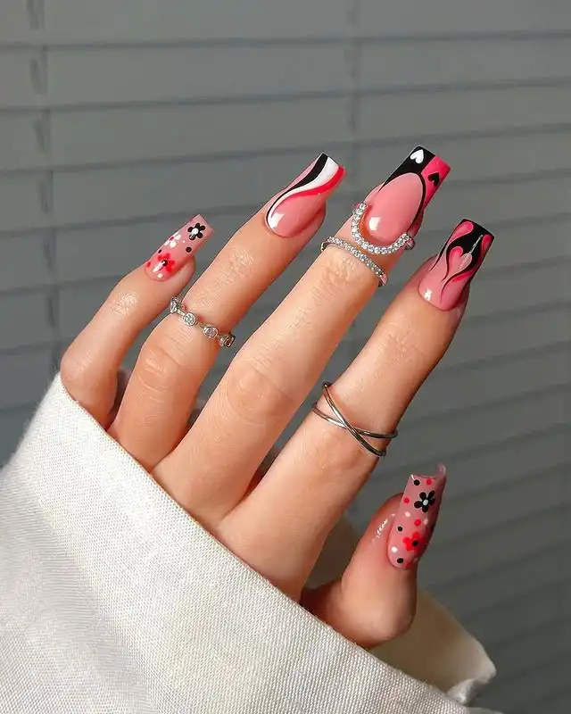 I combined black flames, red flowers, and polka dots for a truly unique mashup. The long coffin shape is decorated with a mix of french tips and full cover art.