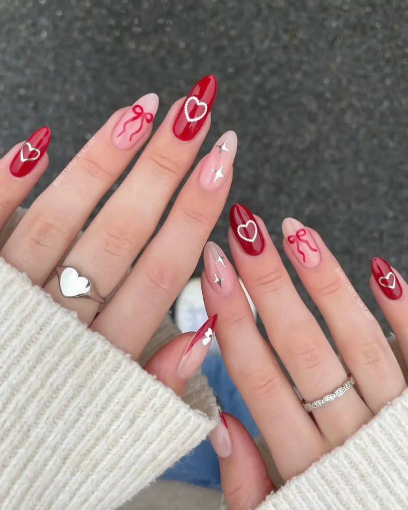 I applied a deep red polish to create a bold and romantic base. Delicate white bows and silver sparkle details provide a feminine contrast.