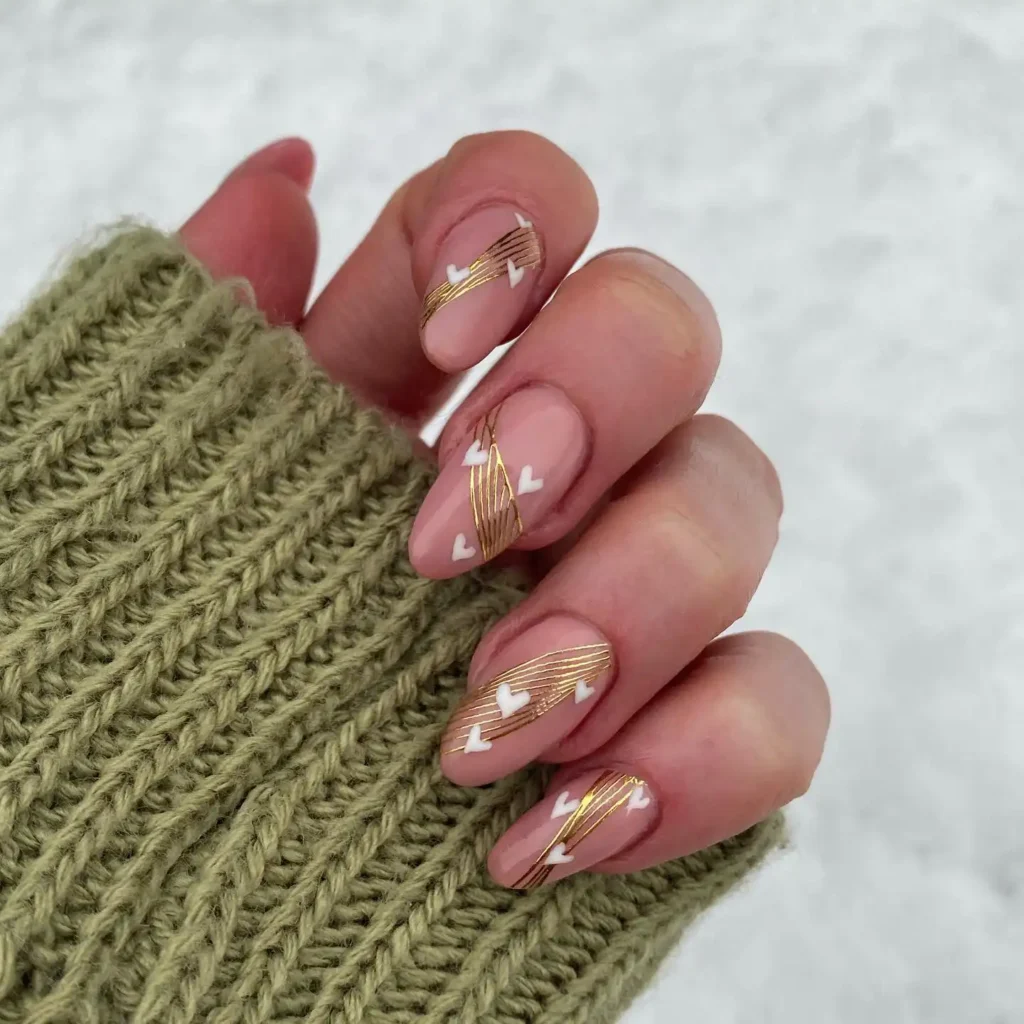 I finished this collection with elegant gold lines that sweep across a natural pink base. Tiny white hearts are tucked between the metallic “threads” like precious charms.