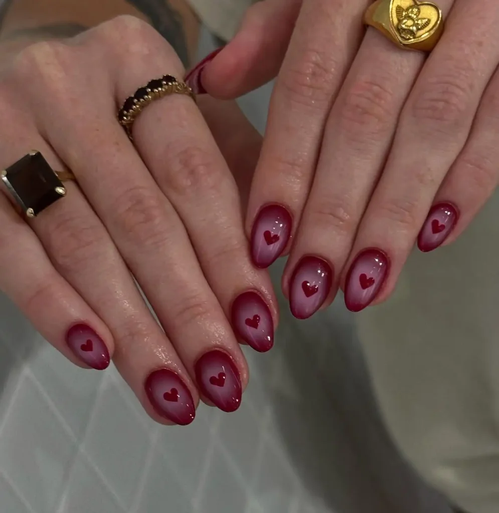 I went with a gradient effect that transitions from dark edges to a bright center. A single tiny heart sits perfectly in the middle of each almond nail.