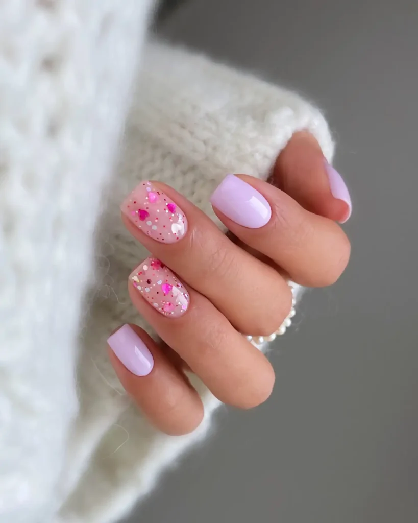 I paired a solid lilac purple with clear nails full of heart sequins. The chunky glitter creates a fun and sparkly dimension.