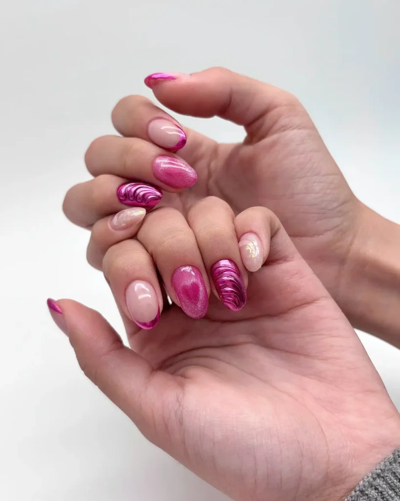 I combined 3D swirls with a striking magenta chrome for a metallic feel. Different textures like velvet glitter and glossy french tips add visual interest.