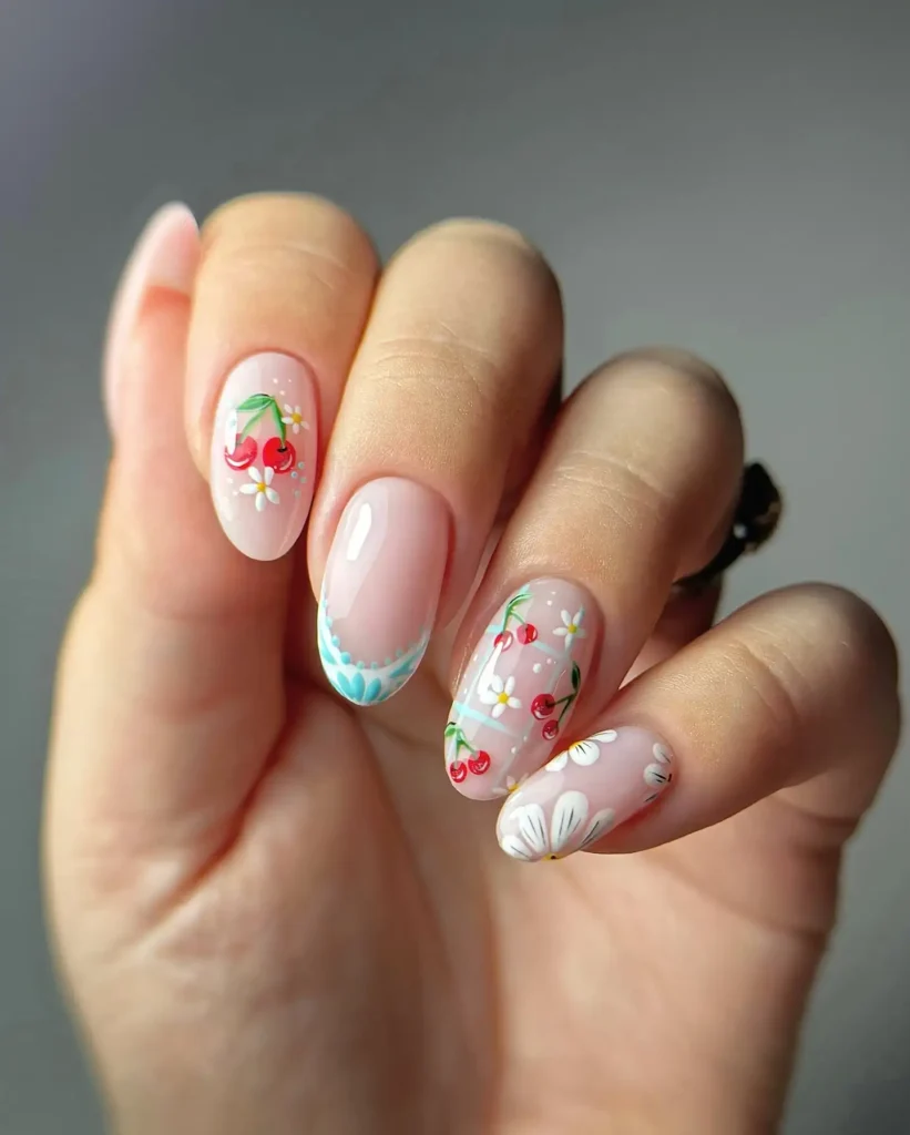 These almond nails instantly give me spring picnic vibes with their delicate cherry and floral accents. The sheer pink base keeps the look light while the tiny details add personality. I’d wear this set when I want my nails to feel playful without being too loud.